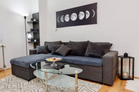 Apartman Moon nalazi se na teritoriji opštine Čukarica u blizini Ade Ciganlije, u ulici Časlava Veljića 46a. Dvosoban apartman se nalazi na prvom spratu kuće i idealan je za boravak do 4 osobe. Površine 38 kvadrata poseduje sve što je neophodno za duži ili kraći boravak. Sastoji se od dnevne sobe sa modernom garniturom na razvlačenje u nastavku se nalazi kuhinja i trpezarijski sto sa stolicama. Odvojena spavaća soba poseduje bračni krevet. Osim prijatnog enterijera, apartman poseduje i internet, televizor, centralno grejanje, veš mašinu, fen za kosu, kao i brojne elemente da učini boravak gostiju što prijatnijim. Besplatan parking je obezbeđen gostima apartmana.