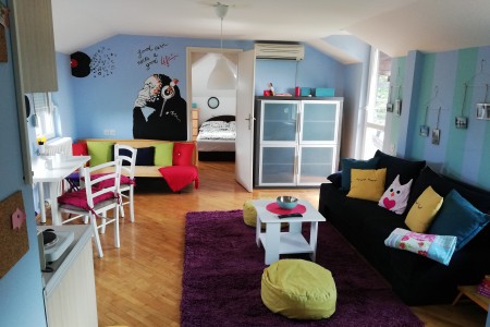 U spavaćoj sobi se nalazi veliki i udoban bračni krevet za dve osobe, a u dnevnoj se nalaze trosed na razvlačenje za dve osobe i dvosed za jednu osobu. U sklopu dnevne sobe nalazi se i kuhinja i trpezarija. Kupatilo je opremljeno tuš kabinom.