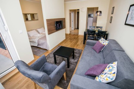 Stan na dan sastoji se iz dnevne prostorije u kojoj se nalazi ugaona garnitura na razvlačenje sa trpezarijskim stolom i stolicama, a spavaći deo izdvojen je zidom i tu se nalazi veliki, udoban bračni krevet. Kuhinja je kompletno opremljena za kraće i duže boravke gostiju. Kupatilo poseduje tuš kabinu i moderne sanitarije.