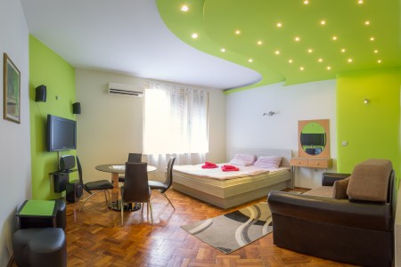 Apartmani u Beogradu- Apartman na dan Magic nalazi se u centru grada u Hilandarskoj ulici. Ovaj veoma atraktivan apartman moze da primi do 3 osobe i pogodan je bilo za kraći ili duži boravak. Smešten je na trećem spratu stambene zgrade. Sastoji se od dnevne sobe koja je istovremeno i spavaća s obzirom na to da se u njoj nalaze francuski ležaj i dvosed na razvlačenje. Savremeno je još opremljen plazma tv-om i dvd-em. Internet je takodje na raspolaganju svim gostima. Trpezarijski deo je zanimljiv svim gostima posto je tu pored totalno opremljene kuhinje i ogroman šank sa nekoliko barskih stolica i svi gosti uglavnom najvise vole tu da provode vreme. Odmah pored se nalazi i kupatilo sa tuš kabinom. Centralna lokacija čini ovaj apartman veoma popularnim kod naših gostiju, a lokacijski je odlično povezan sa svim delovima grada. Dobrodošli!