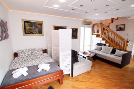 Apartmani u Beogradu- Apartman Art 1 je vrlo prostran i udoban stan na dan, nalazi se u strogom centru grada u Nušićevoj ulici. Apartman se nalazi na 6-om spratu zgrade sa liftom i s obzirom na to da je okrenut ka dvorištu, izolovan je potpuno od ulične buke, sa divnim pogledom na grad. Apartman je dupleks: na prvom nivou se nalazi moderno opremljena kuhinja sa prostorom za ručavanje, toalet, dnevna soba sa terasom, deo sa pisaćim stolom i paravanom odvojen spavaći deo. Na gornjem nivou apartmana su dve spavaće sobe , kupatilo sa hidromasažnom kadom i hodnik sa ugradnim plakarima. Apartman je pogodan za smeštaj do 12 osoba. Nalazi se na samo par koraka od Terazija, Trga Republike, Knez Mihailove ulice, u blizini Kalemegdana i boemske četvrti Skadarlije. Okružen je mnogobrojnim restoranima, barovima, galerijama, pozorištima, pešačkom zonom, parkovima što će učiniti da vaš boravak u Beogradu bude nezaboravan. Dobrodošli su nam poslovni putnici, porodice sa decom kao i grupe od 8-12 osoba. Apartman je renoviran, opremljen novim nameštajem, posteljinom ,peskirima, a gostima je na raspolaganju i etažno grejanje, klima, LCD tv, wifi. Prostrana i udobna dnevna soba sa balkonom pruža maksimalno uživanje tokom boravka gostiju. Ne postoji obezbedjen parking, ali moguće je parkiranje u nekoliko obližnjih garaža. Ovaj apartman vikendom možete iznajmiti na MINIMUM DVA DANA.