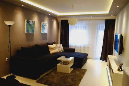 udoban dnevni boravak sa velikom ugaonom garniturom koja se razvlači, u nastavku se nalazi moderna kuhinja koja je odvojena pultom od ostatka prostorije. Na pultu se nalazi indukciona ploča, i rerna. Na gornjem spratu je smeštena spavaća soba sa velikim bračnim krevetom, ona je spojena sa glavnim kupatilom i plakarom. Luksuzno opremljeno kupatilo sadrži đakuzi gde se možete opustiti i uživati, dva lavaboa kao i tuš kabinu. Od dodatnih pogodnosti koje poseduje ovaj apartman na raspolaganju su 3 televizora, wifi, veš mašina za pranje i sušenje veša, klima uređaj i centralno grejanje. Za goste apartmana postoji i besplatan parking kao i garaža koja je dostupna, na upit.