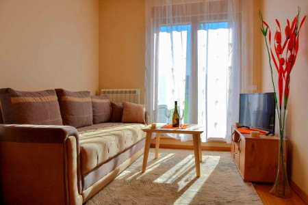 Stan na dan se sastoji od dnevne sobe u kojoj se nalazi ugaona garnitura na razvlačenje. U sklopu dnevne sobe nalazi se i kompletno opremljena kuhinja kao i trpezarijski sto i stolice i iz dnevnog boravka se izlazi na terasu. Spavaća soba je opremljena udobnim bračnim krevetom i velikim prostranim ormanom. U kupatilu su moderne sanitarije i tuš kabina.
