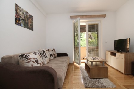 Apartmani Zlatibor- Apartman 6 nalazi se na samo par koraka od poznatog hotela Mona i autobuske stanice. Nalazi se u prizemlju zgrade. Iako je u blizini strogog centra Zlatibora, apartman je potpuno izolovan od buke, tako da ćete na miru uživati u svom odmoru. Predvidjen je za komforan boravak do 4 osobe. Sastoji se od funkcionalno uredjenog dnevnog boravka sa trosedom koji se razvlači u udoban ležaj za dvoje i spavaće sobe sa udobnim bračnim krevetom. Kuhinja se nalazi u sklopu dnevne sobe i potpuno je opremljena kako za kraće, tako i za duže boravke. Kupatilo sa tuš kabinom je prostrano i uredjeno. Dodatnu pogodnost boravka u ovom apartmanu predstavlja terasa sa prelepim pogledom na okolinu! Prateći sadržaj u Apartmanu 6 čine LCD tv, kablovska tv, wifi, čista posteljina i peškiri. Što se tiče grejanja, velika prednost je što gosti pomoću termostata mogu sami da regulišu temperaturu u stanu. Na samo par koraka udaljenosti nalazi se veliki broj znamenitosti koje krase Zlatibor, ali i veliki broj restorana nacionalne kuhinje. Parking je obezbedjen za sve goste ovog smeštaja na Zlatiboru. Dobrodošli u Apartman 6!