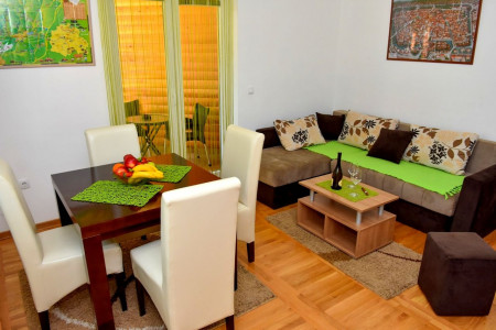 Apartman na dan se sastoji od dnevne sobe u kojoj se nalazi ugaona garnitura na razvlačenje. U sklopu dnevne sobe nalazi se i kuhinja opremljena frižiderom i mikrotalasnom kao i trpezarijski sto i stolice i iz dnevnog boravka se izlazi na terasu. Spavaća soba je opremljena velikim udobnim bračnim krevetom i prostranim ormanom. U kupatilu su moderne sanitarije i tuš kabina. Grejanje je podno - električni kotao sa zasebnim regulatorom.