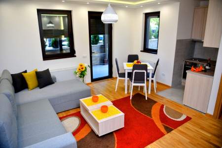 Apartman na dan ima dnevnu sobu u kojoj se nalazi ugaona garnitura na razvlačenje. U sklopu dnevne sobe nalazi se i kompletno opremljena kuhinja kao i trpezarijski sto i stolice. Iz dnevnog boravka se izlazi na terasu sa prelepim pogledom. Spavaća soba je opremljena udobnim bračnim krevetom i velikim prostranim ormanom. U kupatilu su moderne sanitarije i tuš kabina.