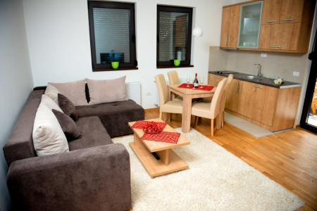 Apartman na dan se sastoji od dnevnog boravka, spavaće sobe, kuhinje, kupatila i terase. U dnevnom boravku se nalazi ugaona garnitura na razvlačenje. U sklopu dnevne sobe nalazi se i opremljena kuhinja kao i trpezarijski sto i stolice. Iz dnevnog boravka se izlazi na terasu sa prelepim pogledom. Spavaća soba je opremljena udobnim bračnim krevetom i velikim prostranim ormanom. U kupatilu su moderne sanitarije i tuš kabina.