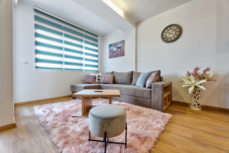 Apartman na dan se nalazi na 3 spratu nove zgrade koja poseduje lift. Prostire se na 45 m2 i idealan je za boravak do 4 osobe. Sastoji se od dnevnog boravka koji je opremljen ugaonom garniturom koja se razvlači u ležaj za 2 osobe. U sklopu dnevnog boravka nalazi se kuhinja opremljena sa ugradnom pločom i frižiderom, kao i svim neophodnim elementima za pripremu obroka. Trpezarijski deo čine sto za ručavanje i stolice. Iz dnevne sobe je izlaz na terasu, gde možete uživati u pogledu na planinu ispijajući jutarnju kaficu.