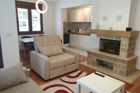 Apartman na dan se sastoji od dnevnog boravka sa garniturom na razvlačenje u čijem sklopu se nalazi i kamin, spavaće sobe sa bračnim krevetom, kuhinje koja je kompletno opremljena sa trpezarijom, kupatila sa tuš kabinom i terase sa prelepim pogledom.