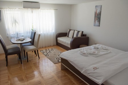 Apartmani Zlatibor- Apartman Zlatiborski Andjeo 4 nalazi se u sklopu kompleksa apartmana, nedaleko od centra i autobuske stanice. Kompleks raspolaže sa 18 moderno uredjenih apartmana, tako da su pogodni za veće grupe, porodice sa decom, ali i parove koji žele da uživaju u privatnosti i kućnoj atmosferi kojom odišu apartmani Zlatiborski Andjeo. Apartman Zlatiborski Andjeo 4 je namenjen za prijatan boravak do 4 osobe. Sastoji se od prostorije sa 2 fotelje na razvlačenje i bračnim krevetom, potpuno opremljene kuhinje i trpezarijskog dela, kao i kupatila sa tuš kabinom. U apartmanu Vam je na raspolaganju sve neophodno kako za kraće, tako i za duže boravke. Za samo par minuta lagane šetnje možete stići do svih važnijih lokaliteta na Zlatiboru. Od dodatnog sadržaja, na raspolaganju su LCD tv, kablovska, wifi, čisti peškiri, posteljina, norveški radijatori. Ukoliko dolazite sopstvenim prevozom, parking mesto Vam je obezbedjeno! Dobrodošli u Zlatiborski Andjeo!