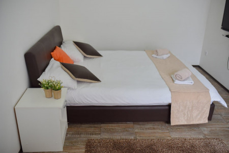 Sastoji se od prostorije u kojoj se nalazi veliki bračni krevet, zatim kuhinje koja je opremljena svim neophodnim elementima, kupatila sa tuš kabinom i trpezarijskog stola.