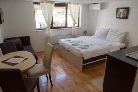 Apartmani Zlatibor- Apartman Zlatiborski Andjeo 3 nalazi se u sklopu kompleksa apartmana, nedaleko od centra i autobuske stanice. Kompleks raspolaže sa 18 moderno uredjenih apartmana, tako da su pogodni za veće grupe, porodice sa decom, ali i parove koji žele da uživaju u privatnosti i kućnoj atmosferi kojom odišu apartmani Zlatiborski Andjeo. Apartman Zlatiborski Andjeo 3 je namenjen za prijatan boravak do 3 osobe. Sastoji se prostorije u kojoj se nalazi bračni krevet i fotelja na razvlačenje (za treću osobu), potpuno opremljene kuhinje i trpezarijskog dela, kao i kupatila sa tuš kabinom. U apartmanu Vam je na raspolaganju sve neophodno kako za kraće, tako i za duže boravke. Za samo par minuta lagane šetnje možete stići do svih važnijih lokaliteta na Zlatiboru. Od dodatnog sadržaja, na raspolaganju su LCD tv, kablovska, wifi, čisti peškiri, posteljina, norveški radijatori. Apartman je komforan, funkcionalan i svetao. Dodatnu pogodnost predstavlja to što ukoliko dolazite sopstvenim prevozom, parking mesto Vam je obezbedjeno! Dobrodošli!
