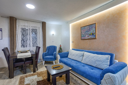 Sastoji se od dnevnog boravka sa kuhinjom i trpezarijskim delom. U dnevnom boravku dominira plavi dvosed i fotelja, kuhinja je opremljena sa ugradnom pločom i frižiderom, a trpezarijski deo čine sto za ručavanje i stolice. Ima dve spavaće sobe koje su opremljene sa velikim bračnim ležajevima. Kupatilo je modernih sanitarija opremljeno sa tuš kabinom.