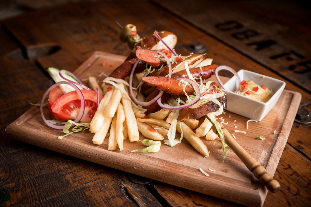 - "JEDNO MESTO" (pržena jaja na tost hlebu, kobasice, kravlji sir, paradajz, paprika, rukola, senf) --- 340