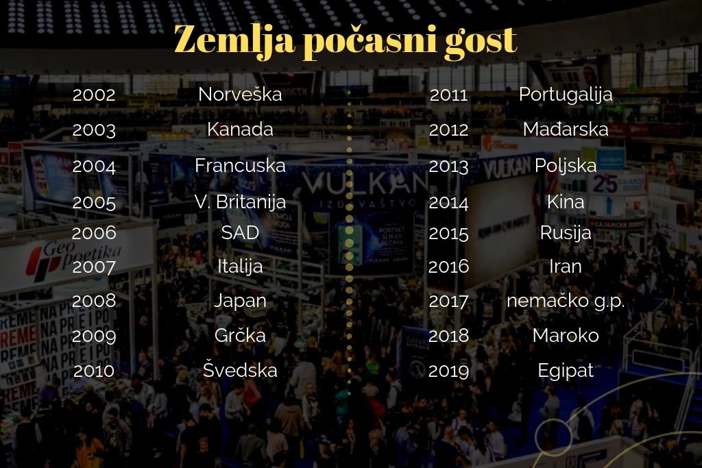 Od 2002. godine (od kada postoji zemlja počasni gost) 17 zemalja bilo je u prilici da se predstavi sajamskoj publici. Iako različitih jezika, kultura i tradicija, ove zemlje ipak imaju i nešto zajedničko - ljubav prema knjizi i pisanoj reči koja ne zna za granice.