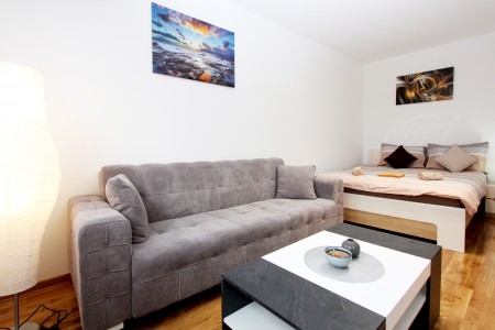 Belgrade Apartments - Apartment Baruh is a neat and bright studio apartment that consists of three rooms: bathroom, kitchen with dining room and living-sleeping part. In all three rooms he enters the corridor. To the left is a small bathroom packed with basic sanitary facilities, a shower cabin and a washing machine. In front of the front door there is a kitchen with a dining room for three, and on the right there is a large room. As the central room of this apartment, it has a double bed on one, and a part intended for living room, on the other side. There are a sofa, a cot, a chest of drawers with a TV and a wardrobe. The sofa is stretched, but it is slightly narrower and suitable for sleeping a third person, so a sleeping arrangement is possible 2 + 1. Location of apartments Baruh is Donji Dorćol. The "strict center" can be reached by a fifteen-minute walk, while the Zoo, sports center Milan Gale Muškatirović or the Danube Quay is somewhat closer. All in all, if you need a nice apartment for two or three people in Belgrade, Baruh apartment is a good choice.