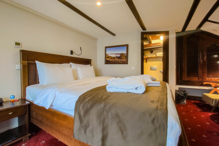 The room is equipped with a double bed, LCD TV and a space to enjoy comfortable armchairs. The whole room is furnished with furniture made of natural materials.
