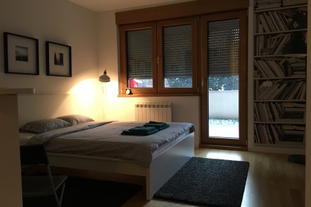 Apartments in Belgrade - Apartment Basta is located on the ground floor of a brand new complex in the New belgrade municipality, it is 30 square meters in size, and can accommodate up to two guests. This Belgrade daily rent apartment has an open studio concept, thus the bedroom with a comfortable double bed is conjoined with a work space, kitchenette and a dining space, all with a modern, contemporary feel to it. In the vicinity of this Belgrade apartment are the shopping mall Delta city, Bellville neighborhood, Savski wharf and numerous restaurants, cafes, stores and markets, as well as the Airport city, Air Serbia and Belgrade Office blocks. Its large and spacious garden and prime location put this apartment on the list of most desirable Belgrade apartments. At the guests disposal are WiFi, KTV, air condition, the central heating system, an iron, hairdryer and clean bed linen and towels. This apartment for daily rent has excellent connections to the rest of the city, and a private garage for an additional fee of 5 euros per day. For those who don’t want to pay extra fees there is free, public parking spaces available around the building.