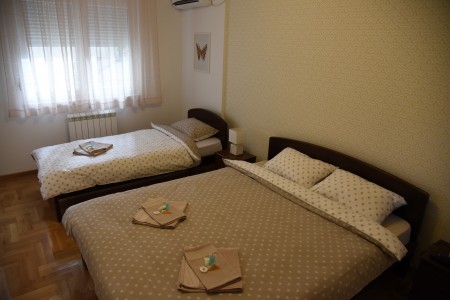 Belgrade Apartments - Apartment Polo 3 is located on Zvezdara, in Jedrenska Street on the first floor of a new residential building of 6 floors, with an elevator. It is designed for a maximum of 5 people and is located a few meters from King Alexander Boulevard, which is otherwise known for its large number of shopping shops, cafes, restaurants, pastry shops and bakeries. Nearby there is a public transport station, which can be reached in all parts of the city. The apartment is fully equipped with new furniture. It has a living room with an armchair, a two-seater and a dining table with chairs, separated by 2 bedrooms- one with a double bed and one single beside, while the other bedroom with 2 single beds, a closet, an entrance hall with a closet, a bathroom with shower, another separate toilet and terrace. Guests have at their disposal air conditioning, central heating, free WiFi, smart TV, intercom, hair dryer, iron, washing machine. Free parking is available in the garage of the building for guests arriving by car.