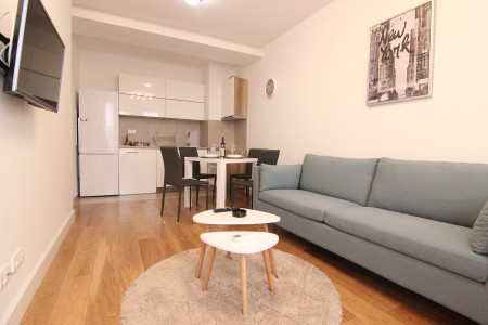 Apartment in Belgrade- Apartment Me is beautifully furnished, very spacious and completely new apartment in exclusive area in New Belgrade. It is located on a 7th floor of a building that has an elevator, just 14 km away from Airport and 5km from city center. There is a parking place in a garage for our guests. This daily rent apartment consists of a living room, 2 separate bedrooms, kitchen with a dining area, entrance hall, bathroom, beautiful terrace and it is predicted to accommodate up to 4 people. There is a bedding set in a living room and a comfortable double bed in each bedroom. Bathroom has a shower and a washing machine, so the apartment is predicted for longer stay as well as for shorter stay. If you are looking for modernly equipped apartment, Mea is a right choice for you! Central heating, air condition, wifi, cable tv, clean bed sheets and towels are also available. Apartment is located at on of the most popular location in the city, close to the every city event and in a very peaceful neighborhood at the same time. It is very close to shopping malls, supermarkets, banks and business centers. Belgrade Arena is just 1,4 km away. Welcome!