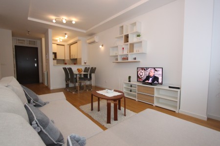 Apartments Belgrade - Apartment Diona is located in the new settlement A Blok, near Delta City, in New Belgrade. Apartment per day is two bedroom, has 40 m2 suitable for a stay of up to four people. Living room and dining area, and the kitchen is separated by a bar. A comfortable corner set is available which provides a bed for two adults when needed. At hand there is a cozy coffee-table and a dressing-room with decorative objects and LED TV. An interesting composite shelf is a very interesting partition, whose partitions spread stepwise and take the form of a crossover. The kitchen is equipped with modern electrical appliances such as kettle, toaster, cooker with heated microwave and oven. The combination of floor ceramics, white veneer and natural wood works very pitifully and impeccably clean. In the bedroom we meet a massive double bed, equipped with a soft mattress and a set of fresh towels. In addition to the room lamp and a large closet, the room also has a separate air conditioning. The bathroom is covered with tiles A class and technically well equipped. In addition to basic sanitary facilities, a shower cubicle, a heater, a boiler, a washing machine and a basket with clean towels are available.