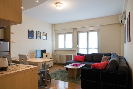 Apartments in Belgrade - Apartment Dorijan is located in Cara Dusana street, in the city center. This daily rent apartment is located on the first floor of a building with an elevator and it is predicted to accommodate up to 4 people. Apartment is modernly designed, fully equipped and functional. It is just a few steps away from Kalemegdan fortress, pedestrian zone Knez Mihailova street and bohemian quarter Skadarlija. It consists of spacious living room with pull out couch, fully equipped kitchen within the living room, bedroom with comfortable double bed and bathroom with a shower, washing machine and drying machine. Additional amenities are AC, central heating, hair dryer, LCD tv, wifi, cable tv, clean sheets and towels. It represents perfect accommodation in Belgrade for families, business people and tourists. If you are looking for accommodation that is ideal start point for the city tour, apartment Dorijan is your choice. It is also very well connected with other parts of Belgrade by the public transport lines. Welcome!