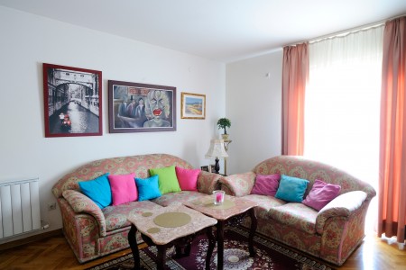 Belgrade Apartments would like to present you one of our apartments in Belgrade – Apartment Gold 3, located in near vicinity of airport Nikola Tesla, Tuluz Lotreka Street. There is a direct bus line 72 connecting the airport and the bus stop (Biodekor) near the apartment. There are numerous shops nearby as well as a gas pump, post office, bakery, pharmacy and the location is well connected with the rest of the city. Apartment is 50 square meters big, situated on the ground floor of a building and is well suited for up to 4 guests. Apartment in Belgrade Gold 3 has a living room with a pull-out sofa, bedroom with a comfortable French bedding, completely equipped kitchen with a refectory, bathroom with a shower cabin and a terrace. Additional contents include central heating, Wi-Fi, cable, TV, closet, coffee machine, ironing accessories, sheets, towels and basic cosmetics. Savski quay, shopping mall Delta City and the rest of the city can be reached within minutes via public transportation. For guests arriving by car there is free parking available in front of the building.