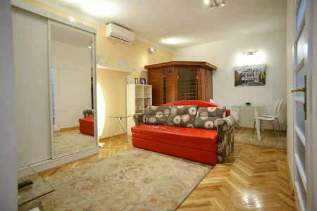 Apartment Hermes is an excellent apartment in the centre of Belgrade with jacuzzi and sauna, located in Cara Dušana Street in Dorćol. The apartment is located on the first floor of a building without an elevator. It can accommodate up to 4 people. It is a very pleasant environment in which you can enjoy and really relax. It consists of a living room equipped with a sofa bed, within the living room there is a dining table and sauna. The bedroom has a comfortable double bed and jacuzzi. The kitchen is small but sufficient for basic needs, has a fridge, induction stove, kettle, dishes. The bathroom has a shower. Guests also have WIFI, TV, cable television,, two air conditioners, heating (marble slab), bed linen, towels. Apartment Hermes is located in a great location, close to Republic Square, Skadarlija, Kalemegdan, numerous restaurants and cafes are available in the area. In addition to a great location, the Hermes apartment offers comfortable accommodation, and if you want to really relax there is a jacuzzi and sauna.