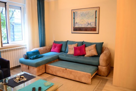 Apartments in Belgrade - Apartment Park is located on the first floor of an apartment building without an elevator, right across the street from the Kalemegdan fortress. This Belgrade daily rent apartment is 50 square meters in size, and can accommodate up to three guests. Apartment Park consists of a living room with a comfortable sofa bed, bedroom with a king size bed, a fully equipped kitchen and bathroom with a shower. At the guests disposal are the central heating system, air condition, WiFi, TV, cable TV, a microwave, kettle, hairdryer, washing machine, an iron and clean bed linen and towels. This Belgrade daily rent apartment is in the very heart of Belgrade, only a few steps away from the main pedestrian zone Knez Mihajlova, as well as numerous cafes, restaurants, boutiques and stores. Parking is not available.