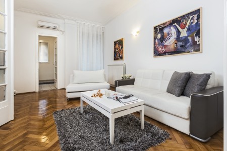 Apartments in Belgrade - Apartment Rakoc A21 is located in Cika Ljubina street, in the city center of Belgrade and it represents perfect accommodation for both short and long stays. Apartment is situated on the second floor of a residential building and spreads on 50 square meters of area. Apartment on the day Rakoc A21 consist of a bedroom, a living room, completely equipped kitchen, a bathroom and a terrace. Bed in the bedroom is 160 cm wide and in the living room there is a pull out three-seater sofa that can be turned into a comfortable bed for two persons. Bathroom is modernly designed and except basic sanitary is equipped with a shower cabin and a washing machine. Daily rental apartment Rakoc A21 is designed for a pleasant stay of up to four persons. Entire apartment is yard oriented and a small terrace is facing the yard. Apartment location is ideal, in the pedestrian zone, in the walking reach to all most important city sights. Despite its central location, apartment is very peaceful and quiet. When additional content is in question is concerned, guests are provided with central heating, air condition, LCD TV, WiFi, cable channels, clean bedding and towels. Parking is available in the closed yard at a