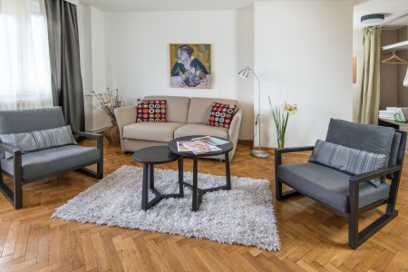 Apartments in Belgrade - Apartment on the day Rakoc A6 is located in the city center of Belgrade, in Cara Urosa Street only few steps away from Knez Mihailova street and Kalemegdan fortress. Apartment is situated on the fifth floor of a residential building with an elevator, designed for a pleasant stay of up to three persons. Apartment Rakoc A6 is very comfortable and it consists of a spacious living room with a pull out corner sofa, a separate bedroom with a double bed, a completely equipped kitchen with a dining area and a bathroom with a bathtub. Additional content of the apartment includes central heating, air condition, LCD TV, WiFi, clean bedding and towels, Apartment is close to a significant number of most important city sights and despite its central location provides peaceful stay, since it is yard oriented. Additional advantage of the apartment is a yard oriented terrace, where you can enjoy your first cup of a morning coffee. If you are arriving by your own transportation, parking in the closed yard is available at an additional charge of 10 euro per day. Welcome!