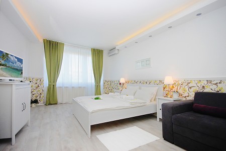Apartments in Belgrade- Toplica apartment is state-of-the-art, fully refurbished apartment located in the heart of the Belgrade with two terraces and a breathtaking view overlooking both sides of Belgrade. It can accommodate up to five adults. Snuggled on the sixth floor of the old town district, this serviced apartment in Belgrade boasts a refreshing interior and a practical sleeping arrangement. The central area of the apartment, that separates the sleeping from the living area is a large, fully equipped (with happy go lucky lights) kitchen with a large breakfast bar and stools for five people. The living room area is furnished with unfolding three seater, a TV and it has the exit to the smaller of the two balconies which faces the yard, but offers a breathtaking view over Belgrade and three bridges. Bathroom is bright and nice, with a rather practical full width enclosure for the shower. Bedroom is the most charming of rooms in the apartment: bland overtones, flowery motifs on wallpapers, draperies, soothing lights and the additional TV set all add up to a pleasant atmosphere. Sleeping arrangement is 2+2+1 – that is, three in the bedroom (the double bed and the fold out armchair) and two in the living room. Location is extremely desirable for those seeking accommodation in the center of Belgrade. A five minute stroll and you are in Belgrade's High street or the central square. Interesting commercial and touristic spots flourish around the neigbourhood, and the proximity of the transport hub Zeleni Venac, guarantees a fine connection to other parts of the city. The most practical spot to look for parking would be in the nearby Obilicev Venac public garage.