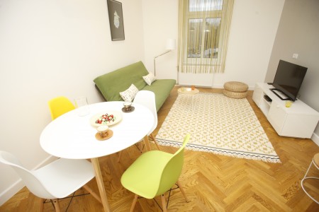 Apartment Tramvaj 1 is modern one bedroom apartment for up to four people. Apartment Tramvaj 1 is an affordable rental in the center of Belgrade, located near the Vuk’s Monument underground station. The interior is marked by tasteful design and sporadically lively details, which is noted already in the living room. The combination of green and yellow furniture, brings a dose of freshness and playfulness in the otherwise pragmatic setting. There are two coffee tables, a dresser with LED TV and a comfortable armchair, placed in the corner. Surely a nice spot to enjoy your morning cup of coffee. We note some abstract artwork and lighting design which contribute to the overall elegance and aesthetic refinement. Let us add that the sofa can be easily transformed into a cozy double bed. The bedroom has a separate TV and a comfy French bed . We notice the heavy drapes, a simple dresser and set of fresh towels. In the hallway, the kitchen units are reduced to basics and set anglewise. We are delighted by the neutral color veneers and the distressed surface between the cabinets. With an available coffee maker and cooktop, your favorite beverage can be easily prepared. The bathroom is impeccably clean and equipped with a shower stall and modern toiletries. Interior spectacle is hardly the strongest suit of this lodging, however, the nearby party zone, traffic links and reasonable price, compensate for any deficiencies. Tashmaidan Park and King Alexander Boulevard are a five-minute walk; the Zira shopping center is a hundred meters in the opposite direction. Being at the corner of Queen Mary and Roosevelt Street, this apartment is perfect for exploring local bars, clubs and taverns. The famous club Tramvaj, with a wide selection of drinks and live gigs, is literally within feet from the building. Suitable for a romantic couple or a small team of friends, apartment Tramvaj 1 is the optimal solution. Welcome! PLEASE NOTE: Only small pets are allowed !!!