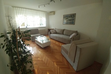 Belgrade Apartments - The apartment Zarkovo is situated in Ratka Mitrovića Street, Čukarica – Žarkovo, on the 1st floor of a small building (4 apartments in total). Its area is 53 m2; it is light, with a bright-colour interior and fully furnished. It can accommodate 1‒4 persons and consists of a living room, a bedroom, a kitchen and a bathroom. The living room is furnished with a large sofa bed and two armchairs (all three of them can be folded out) and a three-piece wardrobe. The bedroom is furnished with a double bed and a large sliding door wardrobe. The kitchen is fully equipped with a dining table, kitchen range, top freezer refrigerator, microwave oven, dishwasher, electric kettle, dishes, cutlery and tableware for 6 persons. The bathroom is equipped with a shower and washing machine. Additional conveniences include Wi-Fi, LCD TV, computer, cable TV, air-conditioner, central heating, ironing board, iron, hair dryer, bed linen and towels. The apartment is situated in the vicinity of a bus stop, with an excellent city traffic connection to downtown Belgrade, Ada Ciganlija, New Belgrade. There are also food shops, a bakery and a post-office nearby. If you are travelling by car, there is a free parking space in the backyard of the building.