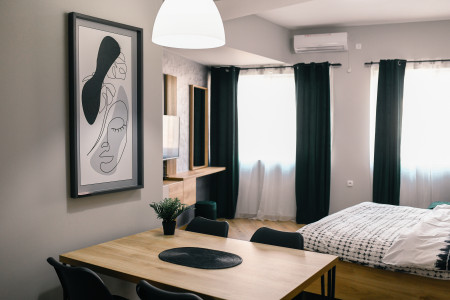 In the very center of the city, from Zmaj Jovina Street to the Ruthenian Greek Catholic Church, there is one of the most beautiful city streets in Novi Sad, Svetozara Miletića Street, or as the people of Novi Sad call it briefly and clearly - Miletićeva. Few streets in Novi Sad can boast that such a large number of famous people, intellectuals, writers and academics lived in it, as Miletić Street can. In the middle of this beautiful and picturesque street is the apartment complex Manoir. A total of 8 apartments fully equipped for short or long stays. The proximity of the promenade in the city center and also the famous Laza Telečki Street as well as the possibility of receiving more guests are the main advantages of the Manoir Apartments. Apartment S3 is located on the first floor and consists of a separate bedroom and kitchen with dining table. It is modernly equipped and within the apartment there is a fully equipped kitchen, underfloor heating, WiFi, air conditioning and cable TV.