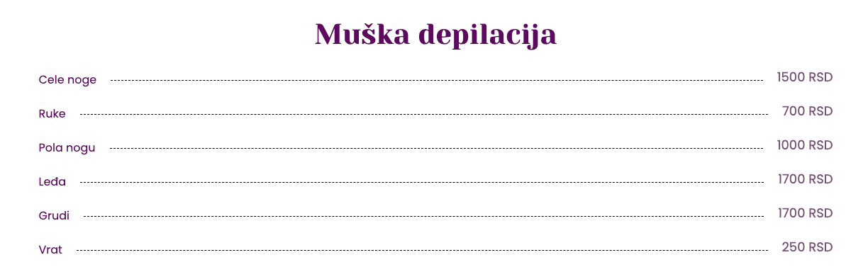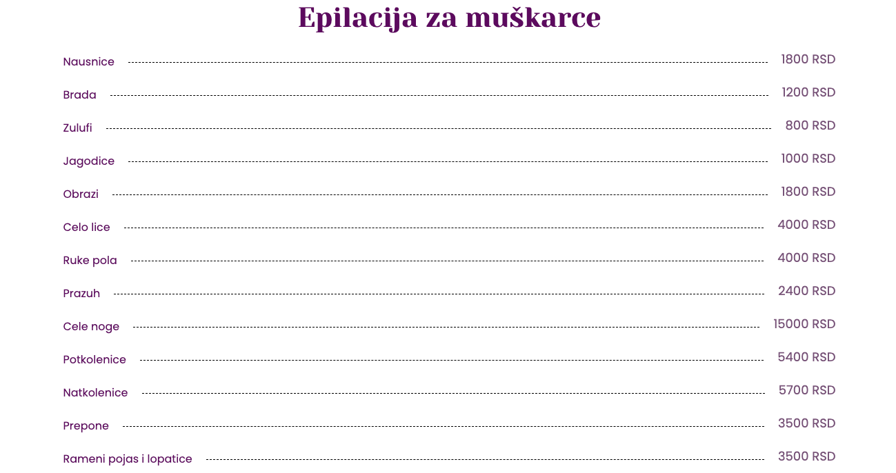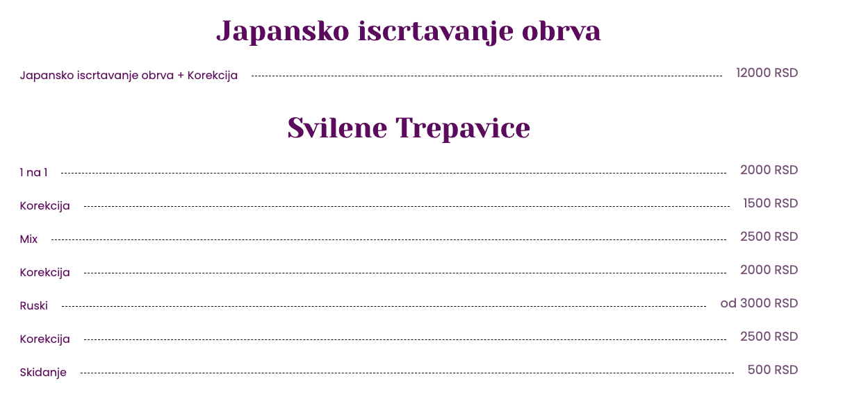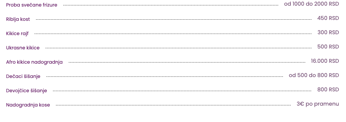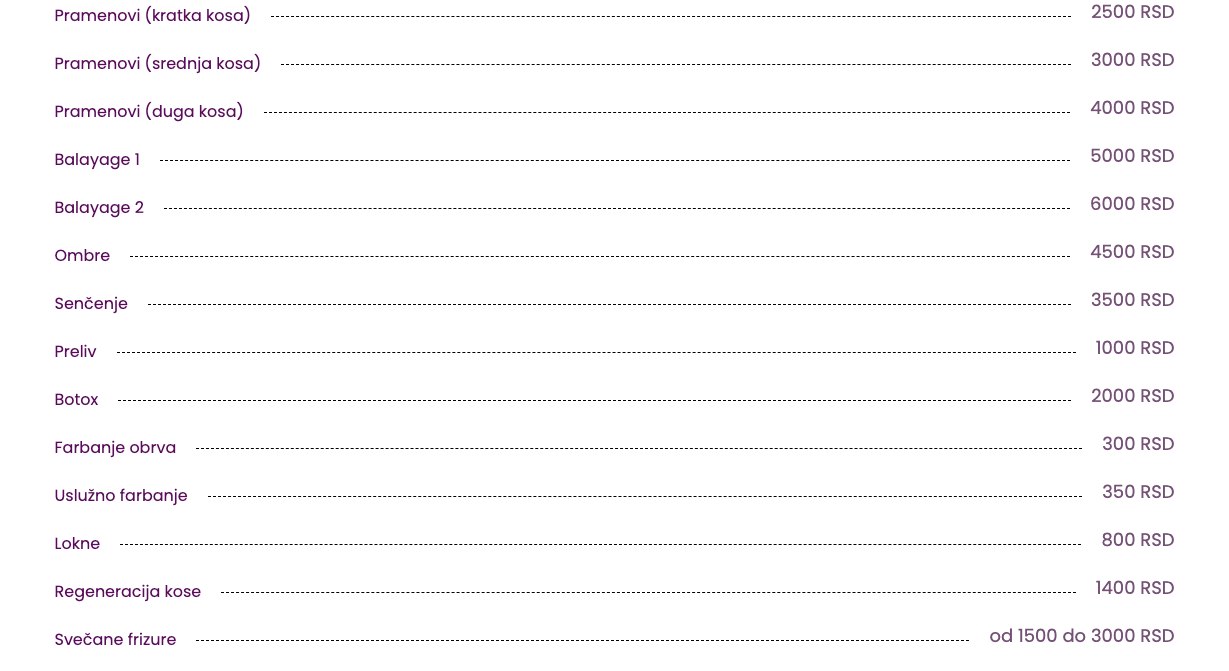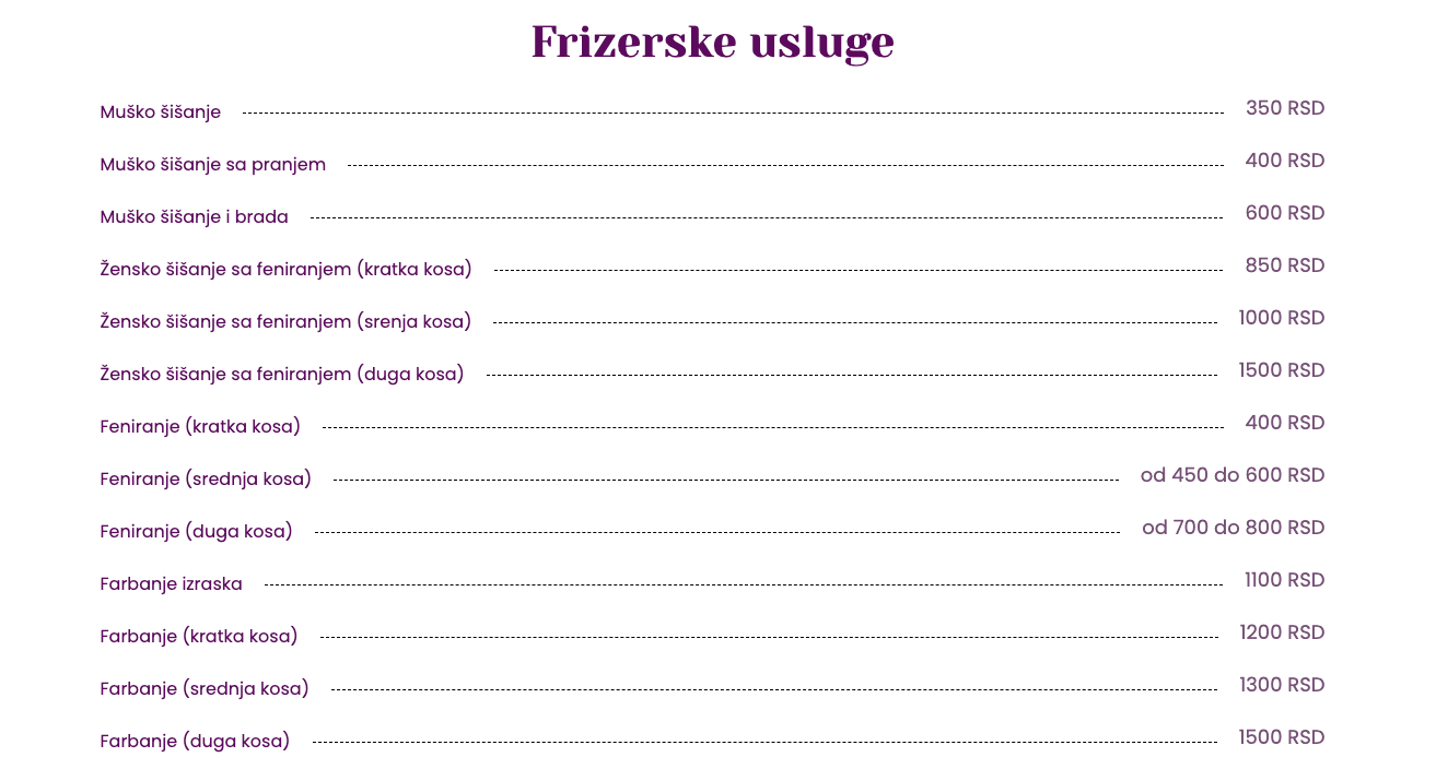 Frizerske usluge I Frizerske usluge II Frizerske usluge III Tretmani Epilacija za žene I Epilacija za žene II Epilacija za muškarce I Epilacija za muškarce II Nokti Japansko iscrtavanje obrva i svilene trepavice Depilacija Muška depilacija| day | From | To |