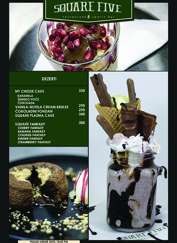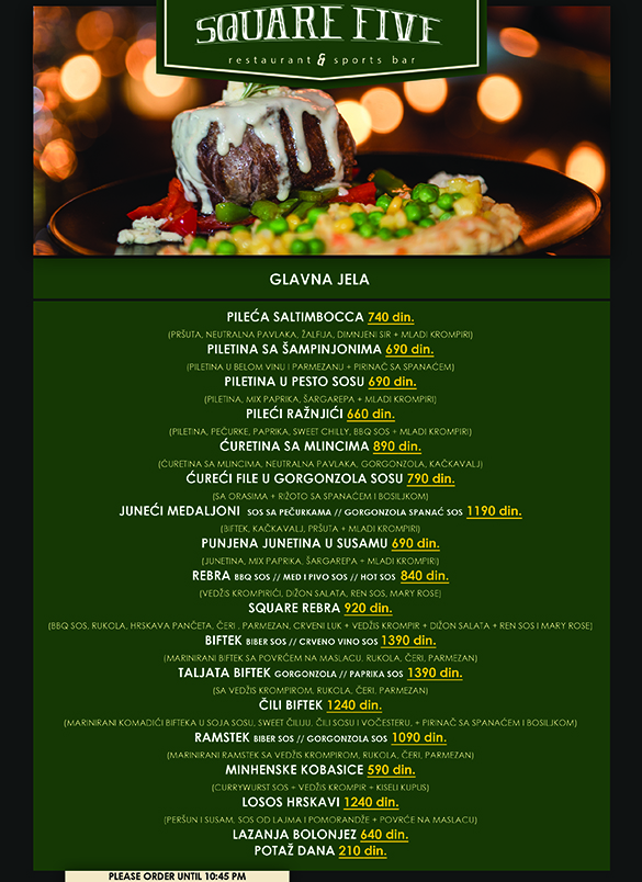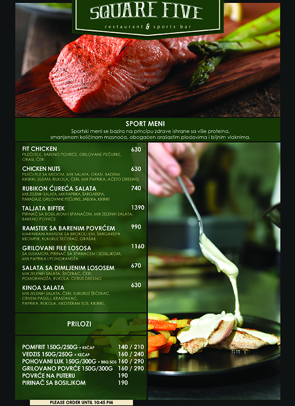 Doručak i salate Glavna jela Italijanska kuhinja Burgeri Sport meni Dezerti| day | From | To |