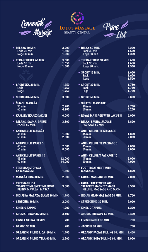 LOTOS Wellness Spa is located in the very heart of Belgrade, in Zmaj Jovina street number 4. Whether you need therapy, crave relaxation or just want to feel like royalty, we have everything your heart desires. Marvelous massages, organic facial and body scrubs, aromatherapy, stretching, shiatsu and of course Jacuzzi and sauna. Our experienced team of experts is there to ensure your complete satisfaction. Treat yourself to a day of indulgence and taste your perfect spa moment.