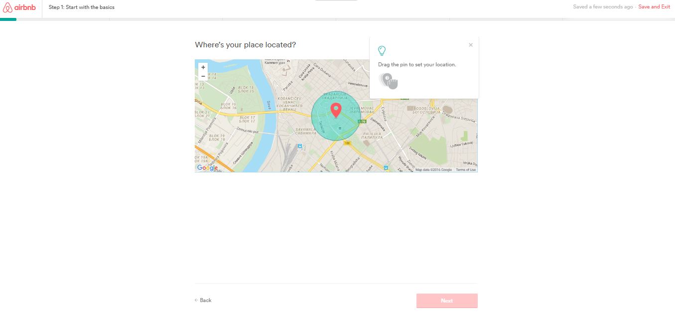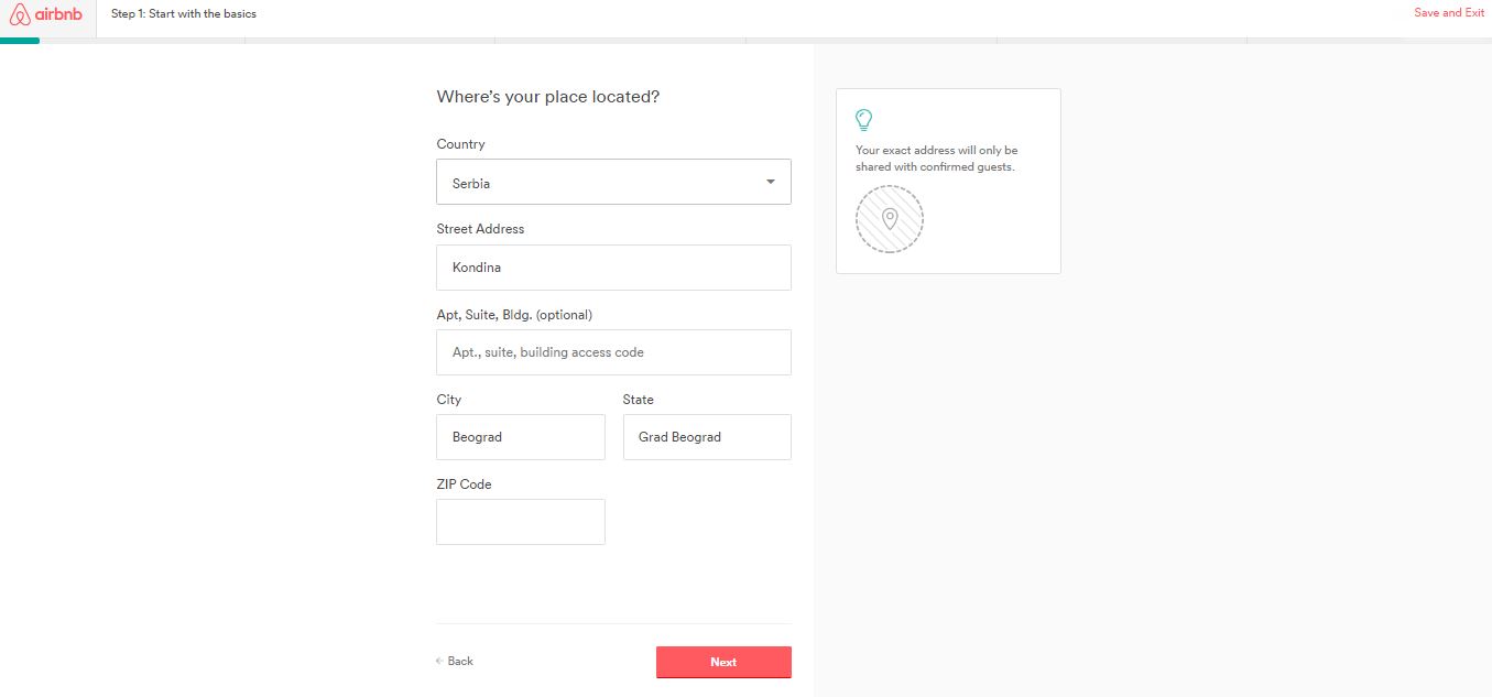 Ovde je potrebno da popunite detaljne podatke o adresi (država, adresa, grad...). Kada popunite sva polja pritisnite dugme "Next". Nakon toga će Vam se prikazati mapa, na kojoj je potrebno da označite tačnu lokaciju apartmana. Kada završite pritisnite dugme "Next".