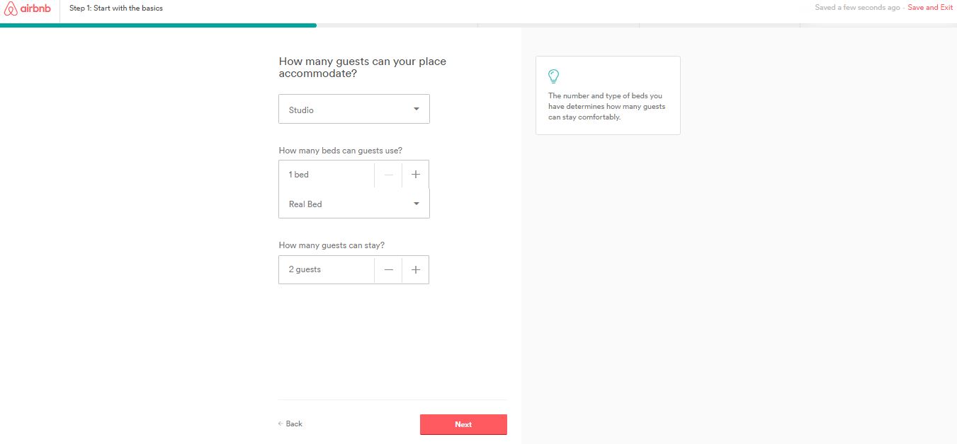 Ovde je potrebno da označite broj soba - kliknite na "Studio" otvoriće se padajući meni sa ponuđenim brojem soba. Označite onjaj broj soba koji Vaš apartman poseduje. Zatim je potrebno da unesete broj kreveta koje apartman poseduje. Ukoliko kliknete na "Real bed" otvoriće se padajući meni gde možete da označite o kojoj vrsti kreveta se radi (pravi krevet, sofa, krevet na naduvavanje itd.), nakon što označite vrstu kreveta pritiskom na + ili - povečavate, odnosno smanjujete broj kreveta. I na kraju je potrebno da označite koliko gostiju Vaš apartman može da ugosti, što takođe radite pritiskom na dugme + odnosno -. Kada završite pritisnite dugme "Next" kako biste nastavili dalje.