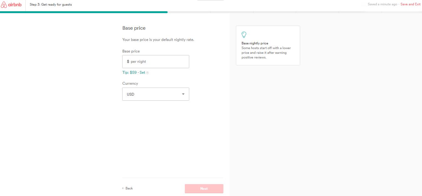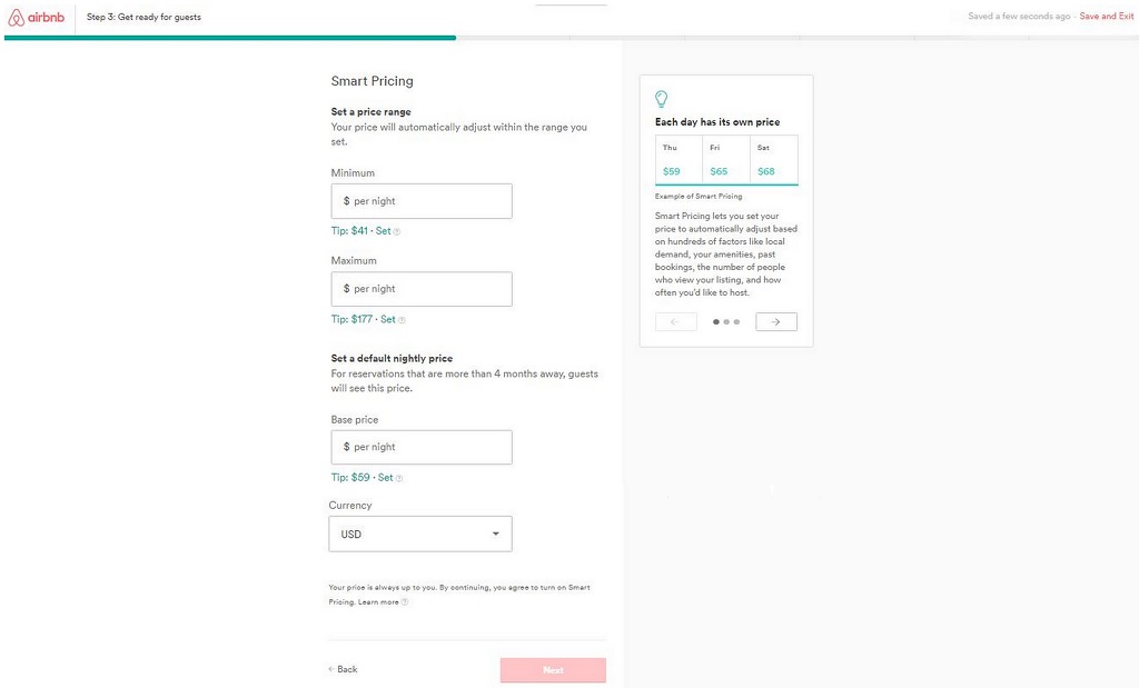 Potrebno je da unesete minumalnu i maksimalnu cenu po noćenju. Ispod svakog od ovih polja videćete cenu koju Vam Airbnb predlaže u odnosu na dosadašnja podešavanja. Zatim je potrebno da unesete uobičajenu cenu (Base price) za rezervacije 4 meseca unapred. Ovo unosite zbog toga što Airbnb može da podešava cenu 4 meseca unapred, a nakon tog perioda prikazivaće uobičajenu cenu koju ste odredili. Takođe ovde možete da odaberete i valutu.