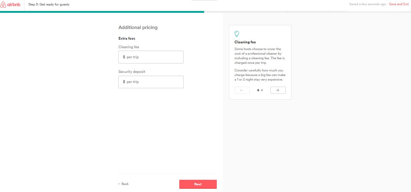 U ovoj sekciji potrebno je da navedete dodatne troškove ukoliko ih naplaćujete. Postoje dve vrste troškova koje Airbnb predviđa, a to su troškovi za čišćenje i depozit. Što se troškova za čišćenje tiče iznos koji navedete odnosi se na celu dužinu boravka gosta. Preporuka Airbnb-a je da pazite koje iznose navodite u okviru dodatnih troškova jer to može da u znatnoj meri poveća cenu noćenja, naročito kod rezervacija koje se odnose na jedan ili dva dana. Ukoliko to želite ne morate da navedete nikakve dodatne troškove, mnogi troškove za čišćenje već uračunaju prilikom određivanja cene noćenja i ne navode ih kao naknadne.