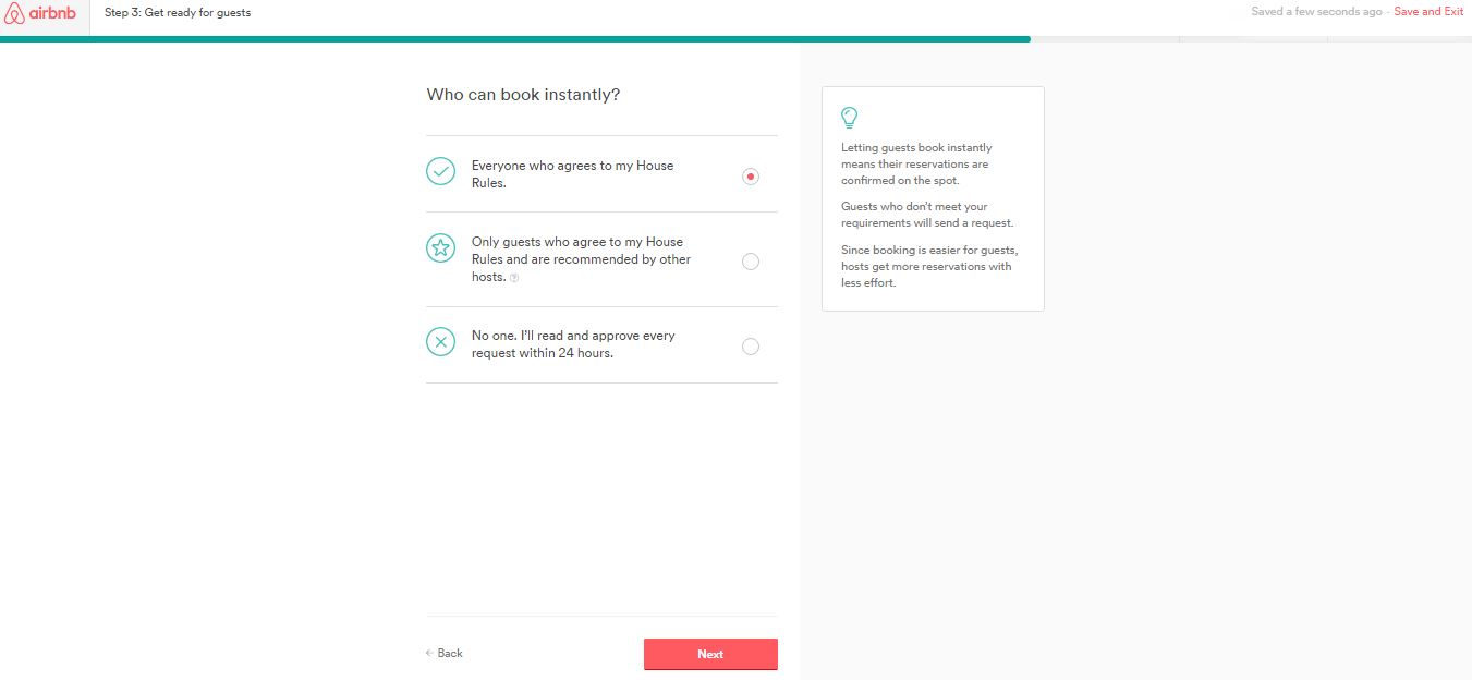 Ovde je potrebno da označite ko može da izvrši instant rezervaciju, što podrazumeva da je rezervacija odmah važeća bez naknadnog odobrenja sa Vaše strane. Ponuđene su Vam tri opcije: „Everyone who agrees to my House Rules“ – svi oni koji prihvate pravila ponašanja koja ste naveli, „Only guests who agree to my House Rules and are recommended by other hosts“ – gosti koji prihvate pravila ponašanja i koje drugi iznamljivači preporuče, „No one. I’ll read and approve every request within 24 hours“ – niko, vi ćete svaku razervaciju odobriti ili odbiti u roku od 24 sata.