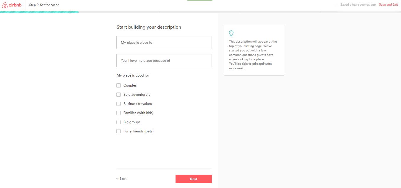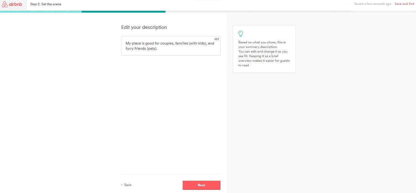 Zatim u drugom polju je potrebno da navedete šta je to zbog čega će ljudi voleti Vaš smeštaj. Takođe će Vam biti ponuđeni odgovori, koje ne morate da koristite. I na kraju je potrebno da označite za koga je Vaš apartman pogodan - da li su to parovi, porodice sa decom, velike grupe, pojedinci ili možda sve od navedenog. Nakon što pritisnete dugme "Next" prikazaće Vam se kako Vaš opis izgleda kad se sve što ste označili spojili zajedno.