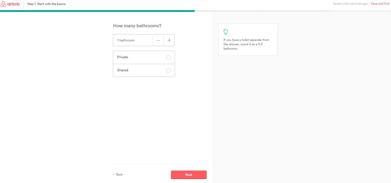 U ovoj sekciji je potrebno da dodate podatke koji se odnose na kupatilo, pre svega broj kupatila koji smeštaj poseduje, što radite pritiskom na + odnosno -. Zatim o kakvoj vrsti kupatila se radi tj. da li je privatno ili zajedničko (označite onu opciju koja odgovara Vašem apartmanu). Pritisnite dugme "Next".
