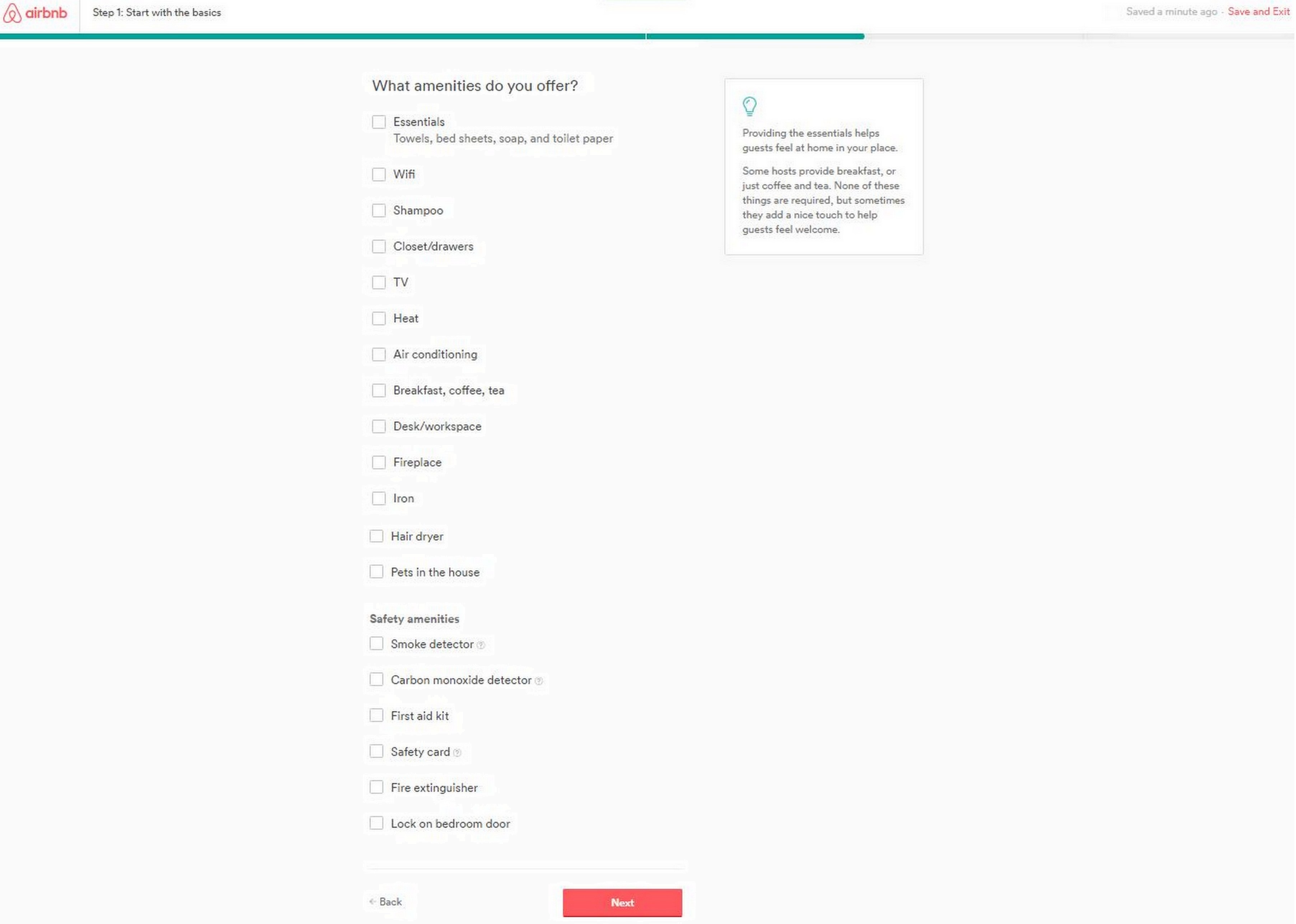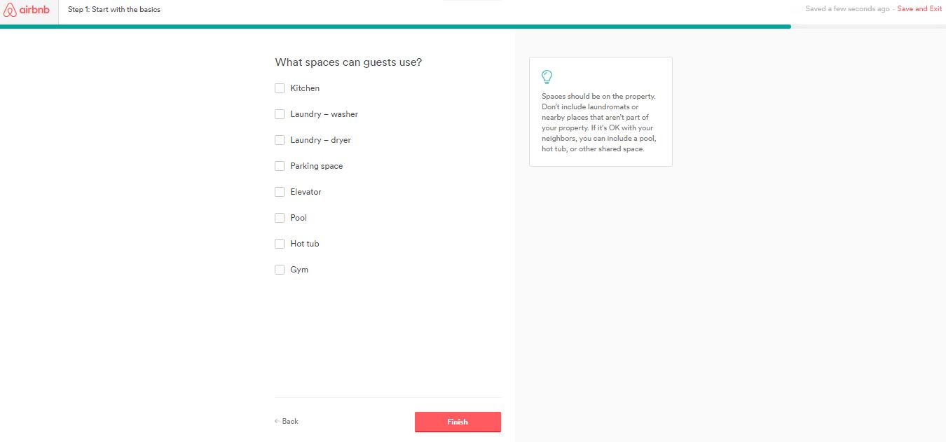U ovoj sekciji označavate koje vrste prostora su na raspolaganju Vašim gostima - kuhinja, lift, parking mesto itd. Ovde su još i svrstane mašina za pranje veša i mašina za sušenje veša. Nakon što označite sva potrebna polja, pritisnite "Finish".