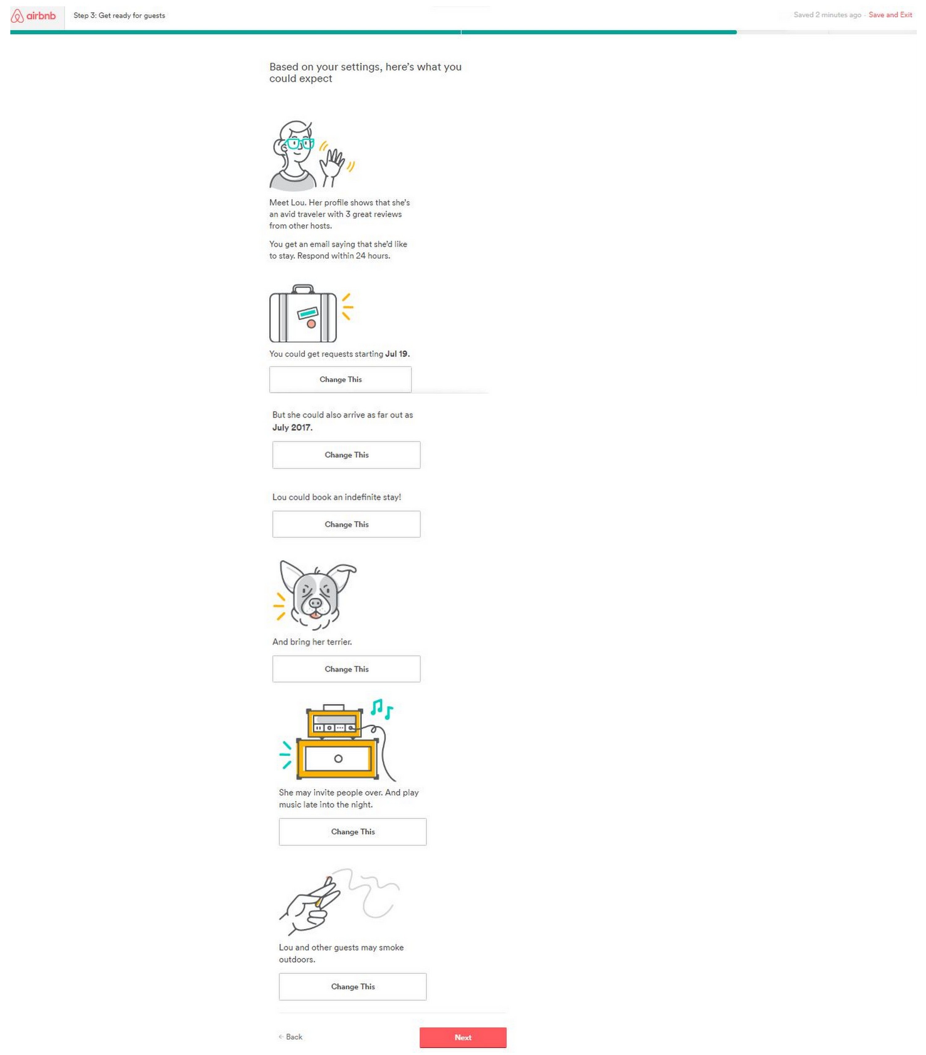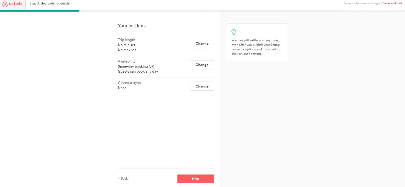 Ovde će Vam Airbnb na osnovu svega što ste naveli na primeru prikazati šta možete da očekujete. Ispod svake stavke postoji dugme „Change“ – pritiskom na njega možete automatski da pristupite tom podešavanju i izmenite ga. Nakon što ste zadovoljni unetim podešavanjima pritisnite „Next“.