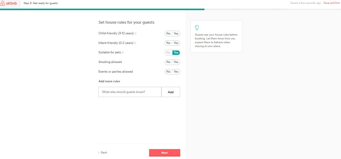 U ovoj sekciji je potrebno da navedete određena pravila ponašanja. Airbnb Vam nudi nekoliko opcija koje određujete kao dozvoljenje pritiskom na „Yes“ ili nedozvoljene pritiskom na „No“, a to su da li je smeštaj pogodan za boravak dece starosti 3 – 12 godine, zatim za boravak dece starosti 0 – 2 godine, za boravak kućnih ljubimaca, zatim da li je dozvoljeno pušenje, i da li je dozvoljeno organizovanje žurki i okupljanja. Pored ovih već predviđenih opcija Airbnb Vam ostavlja mogućnost da sami dodate još neka pravila, koja unosite pritiskom na polje „What else should gurests know“ i zatim pritisnete dugme „Add“ kako biste dodali. Na ovaj način možete uneti više od jednog dodatnog pravila.
