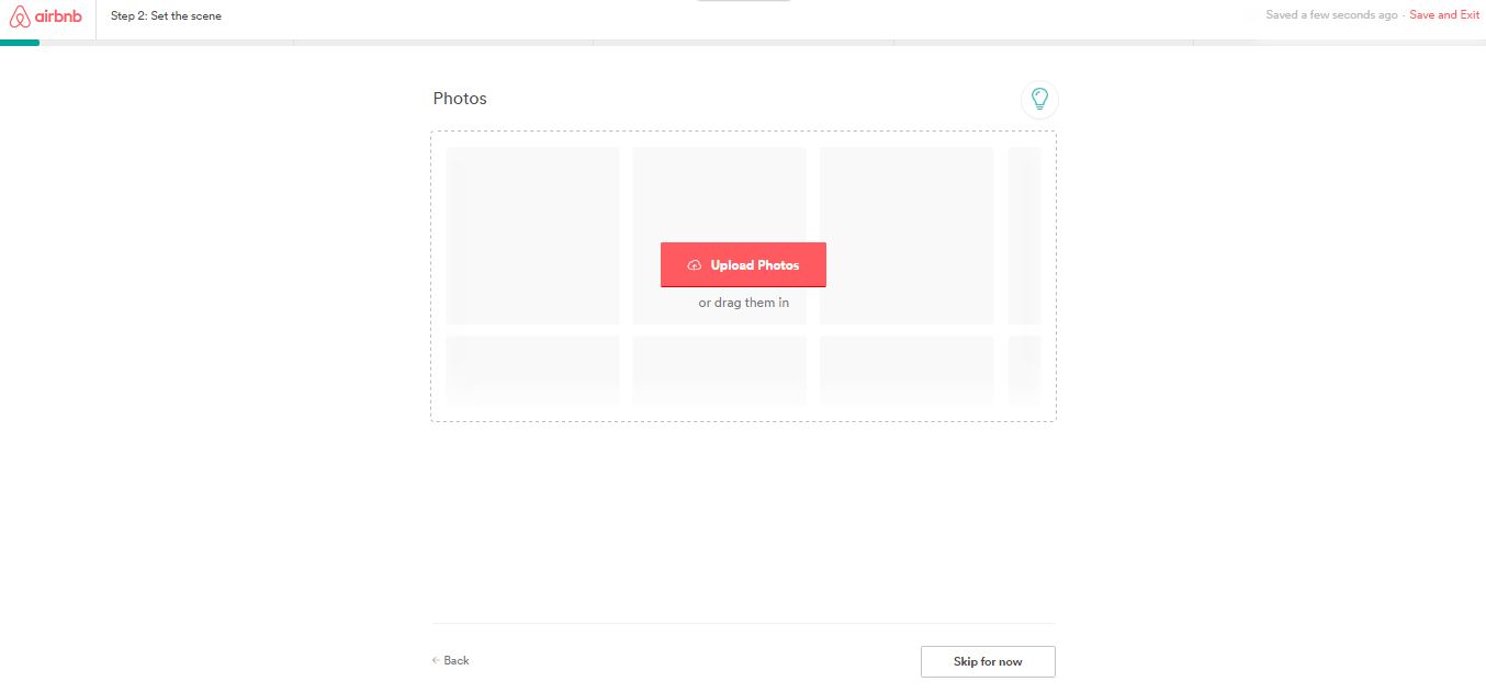 Prva sekcija u koraku 2 se odnosi na slike. Ovo možete i preskočiti ukoliko pritisnete dugme "Skip for now". U svakom slučaju nemojte zaboraviti da dodate slike makar i naknadno, ali obavezno pre objavljivanja svog oglasa. Slike su jedna od najvažnijih stvari i one "prodaju" Vaš apartman. Po preporuci Airbnb-a dodajte bar 8 slika.