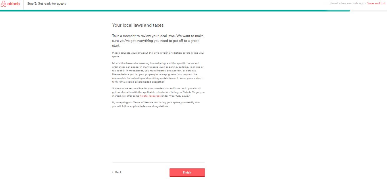 Na ovoj stranici Vas Airbnb obaveštava da je potrebno da se upoznate sa zakonima svoje zemlje koji se odnose na iznajmljivanje smeštaja, i da se informišete o taksama koje je potrebno da platite.
